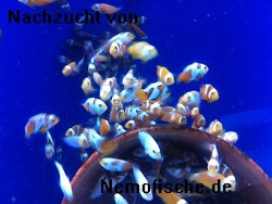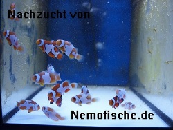 Die Picassos sind für uns die spannendsten Tiere aller Zuchtformen. Nach dem die erste Binde sichtbar geworden ist, sitzen wir mehrmals täglich mit der Lupe vor den Aufzuchtbecken. In den folgenden Tagen entwickelt sich die spätere Zeichnung. Leider sind nur sehr wenige Jungtiere mit einer Verbindung aller Binden. Dies ist die Krönung der Picasso-Zucht. Bei allen unserer Paare sehen die Jungfische anders aus. Auch das Schwarz der typischen percula-Zeichnung ist unterschiedlich. Selbst vom selben Zuchtpaar ist die Anzahl der Picassos sehr variabel bei jeder Brut.