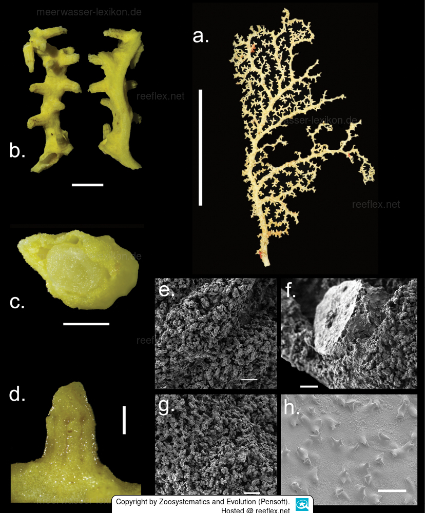 When collected and brought on board, the fresh coenenchyma is pale yellow, the axis appears translucent milky white, and the sclerites appear pale red under the microscope.