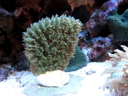 Description: Small colonies have encrusting, laminar or submassive bases with short columns or branches. Large colonies are hemispherical, consisting of compact fused branches. Branches are sometimes flattened towards their tips. Monticules are low and rounded. Tentacles are extended day and night; they are long and shaggy and of uniform length.
