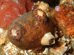 The Tunicata or „Urochordata“, are commonly known as sea squirts. Sea squirts or tunicate are also called sea grapes, because bunches of sea squirts look like bunches of grapes. Sea squirts have transparent or translucent tunics made of cellulose. They vary in size from a few millimetres to 30 cm in length and are cylindrical, circular, or irregular in shape. The body of an adult tunicate is quite simple, being essentially a sack with two siphons through which water enters and exits. Sea squirts feed by drawing water in through their incurrent siphon. Food particles are filtered through the pharynx and digestive tract. Waste products are ejected out the excurrent siphon.
