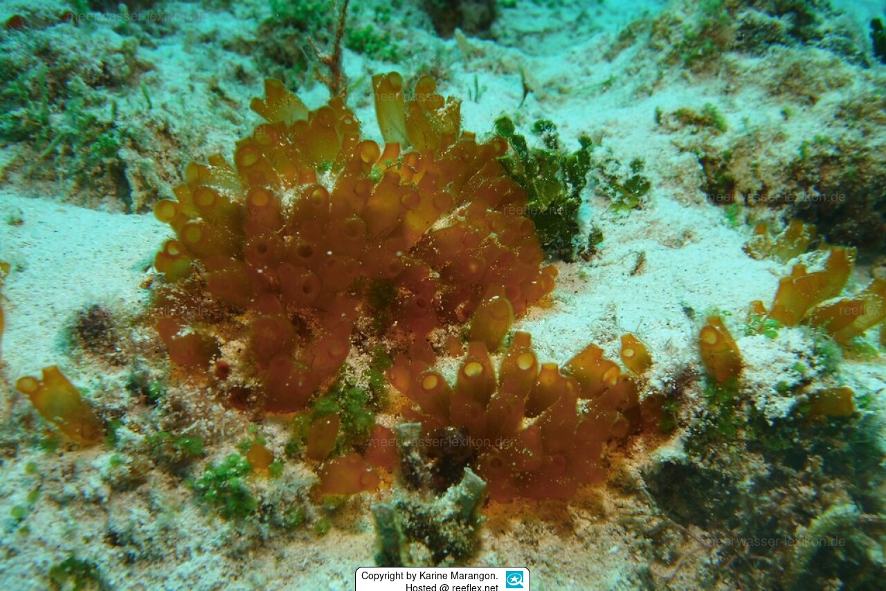 Ecteinascidia turbinata is a colonial sea squirt. The individual zooids can grow to a height of 2.5 cm and are shaped like wide-necked bottles. Colonies can reach a width of 14 cm.