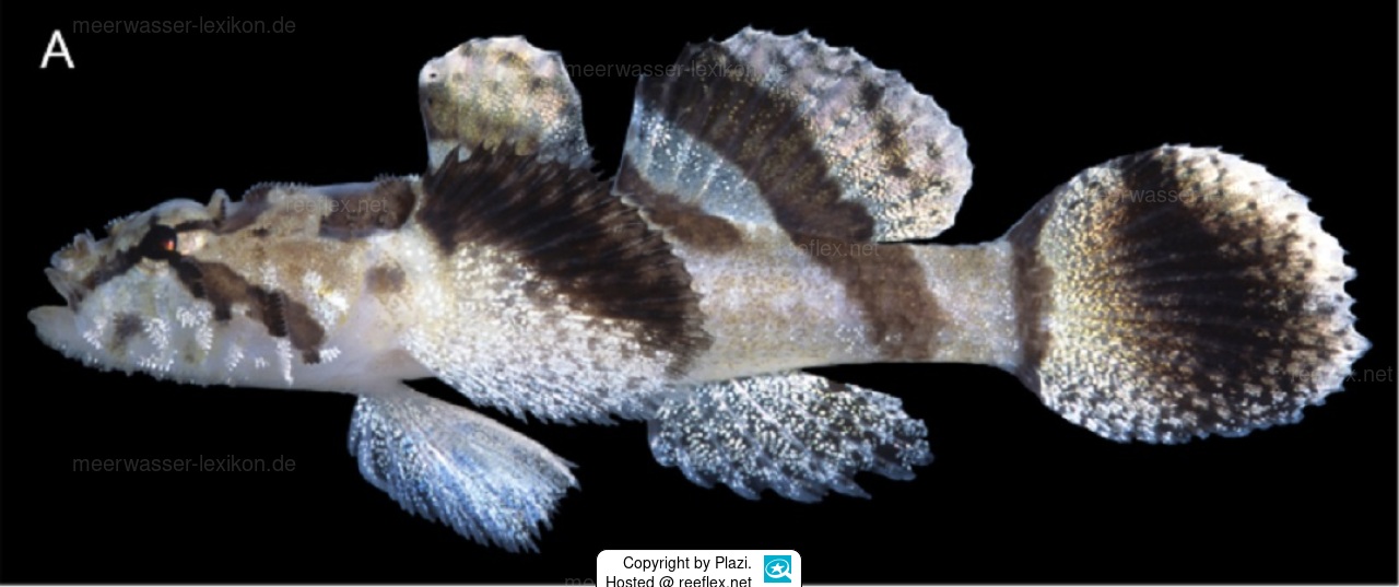 All fins are white basally, the posterior margins of the vertical fins, except the caudal fin, have small, faint black spots (spots are absent on the first dorsal fin margin, which is brownish-yellow).