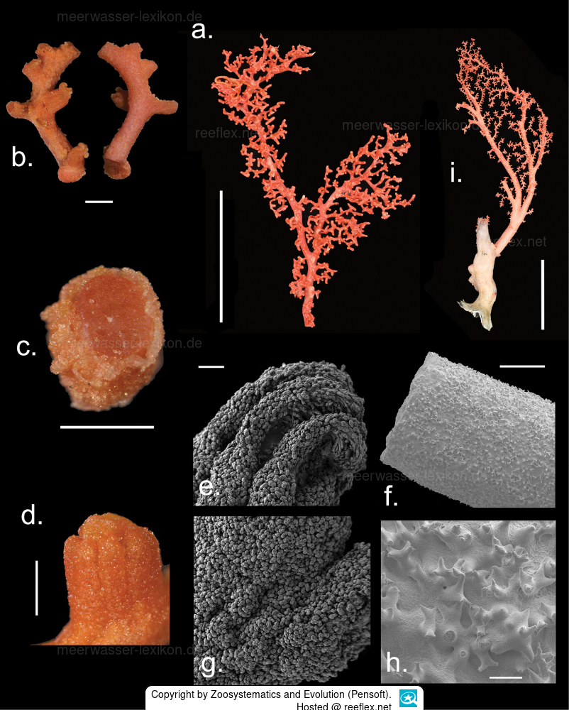 The branches are bright red, with the color becoming paler towards the base. Autozooids are distributed on small branches over half of the colony level.