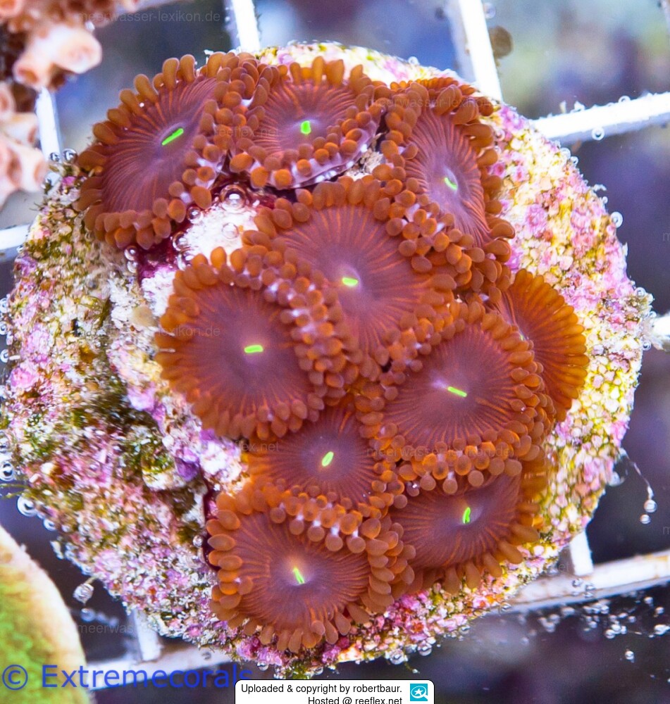 These beautiful Palythoa or button polyps are sold as Palythoa „campfire“ at Local fish Dealers and in online coral Shops. ..