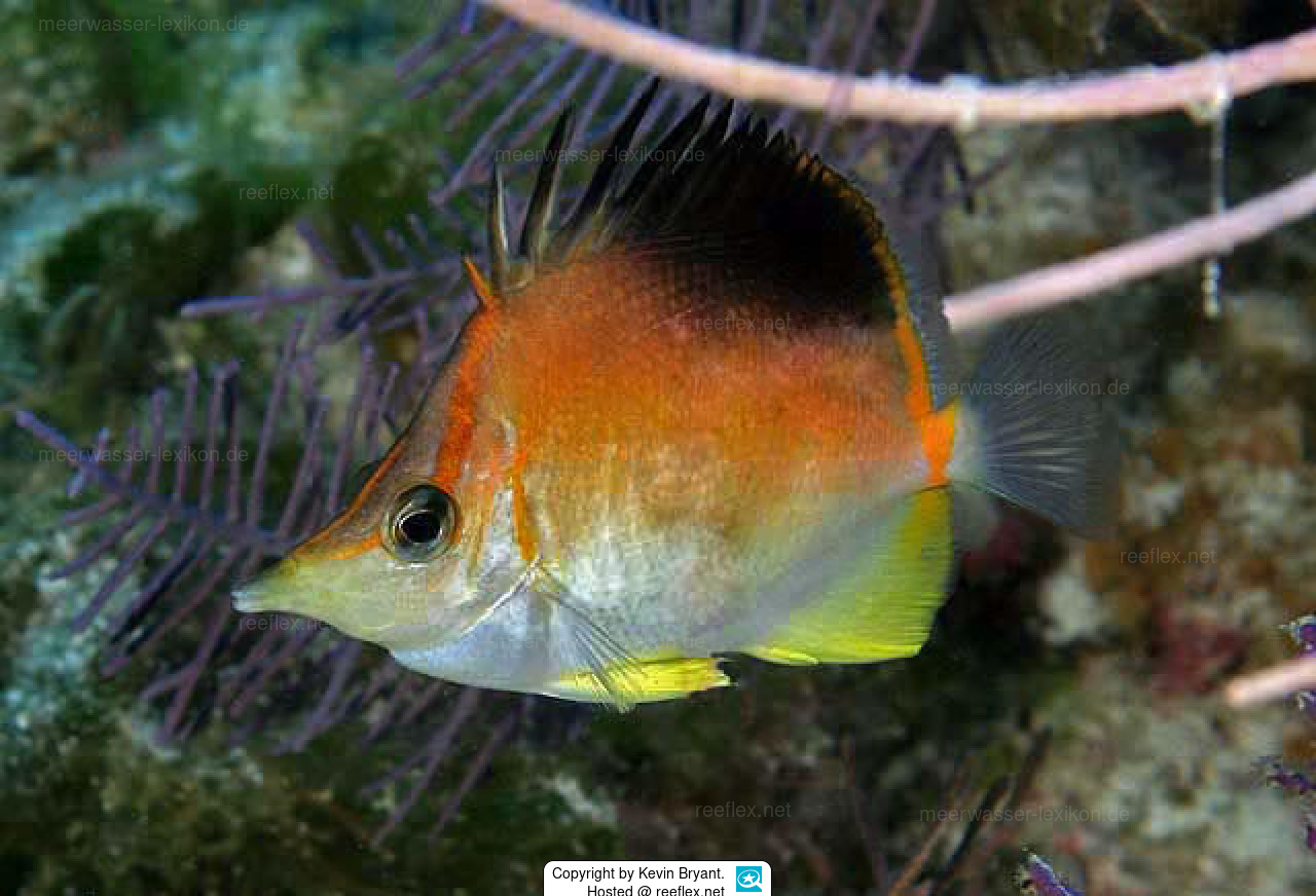 Prognathodes aculeatus upper body is yellow-orange and becoming dark brown in dorsal fin, the lower body and head is whitish. It has a brownish eyeband above eye, continuing as yellow-orange stripe from eye to the upper edge of snout; a median snout stripe is present. An orange stripe extends through soft dorsal fin and crosses caudal peduncle; orange stripe along upper posterior edge of opercle present. The ventral and anal fins are yellow. Caudal and pectoral fins hyaline.