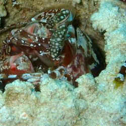 Lysiosquilla lisa has a reddish-brown colour with white spots on the eyes.