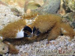 Meine Borstenkrabbe habe ich mittlerweile seit zwei Jahren. Anfangs wollte ich sie entfernen, aber sie entwischte immer wieder, heute bin ich froh darüber! Sie ist sehr friedlich, lebt in Bodennähe im Lebendgestein. Meine Krabbe hat ihre Wohnhöhle mit Einsiedlerhäuschen ausgekleidet, davon liegen immer welche im Becken. Sie vergreift sich bei mir an keinen Korallen!