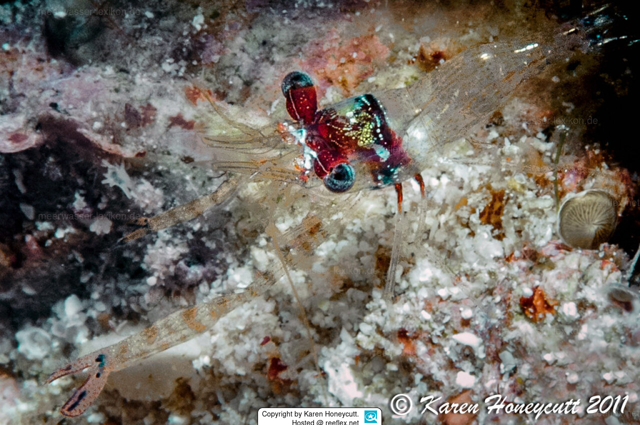Commonly known as the Red-eyed shrimp. Can be found amongst coral rubble and under stones.