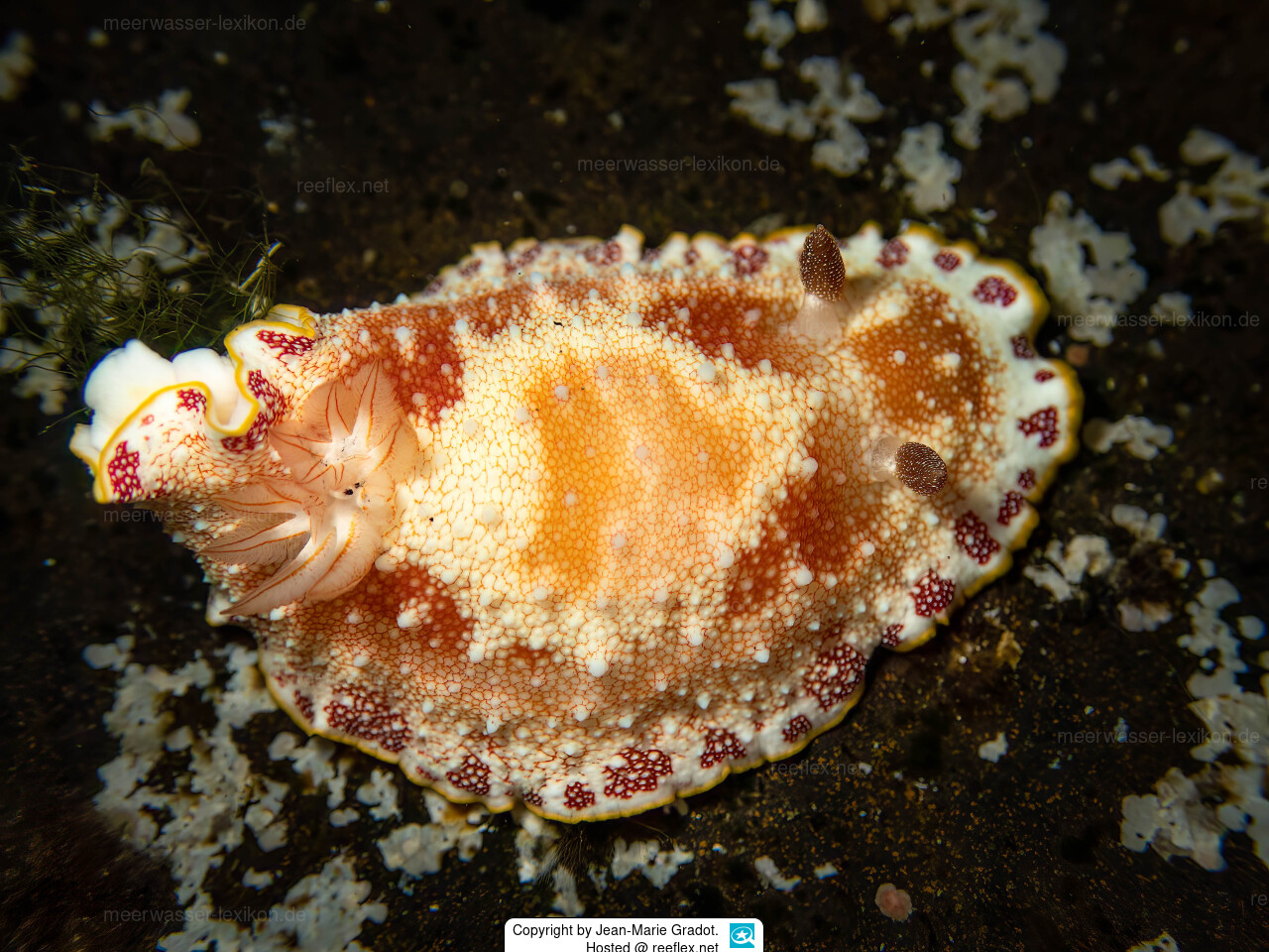 Goniobranchus tinctorius have a yellow line around the foot. This sea slug can be found on reef to a depth of at least 21 m. The red-netted goniobranchus feeds exlusively on sponges.