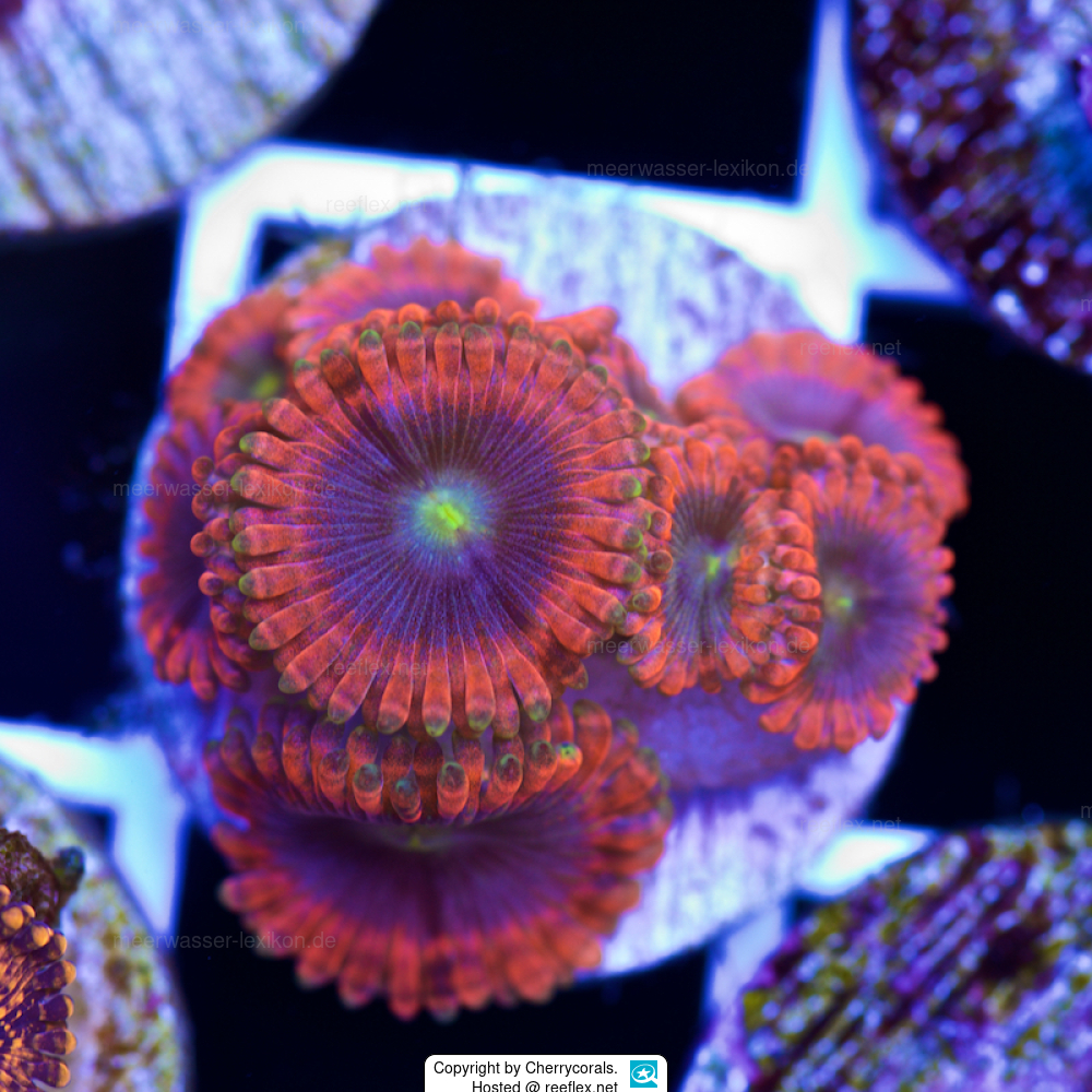 These beautiful Palythoa or button polyps are sold as Palythoa „Flower Power“ at Local fish Dealers and in online coral Shops. .. Many Thank to Cherrycorals for the wonderful picture.